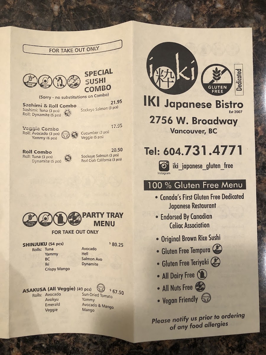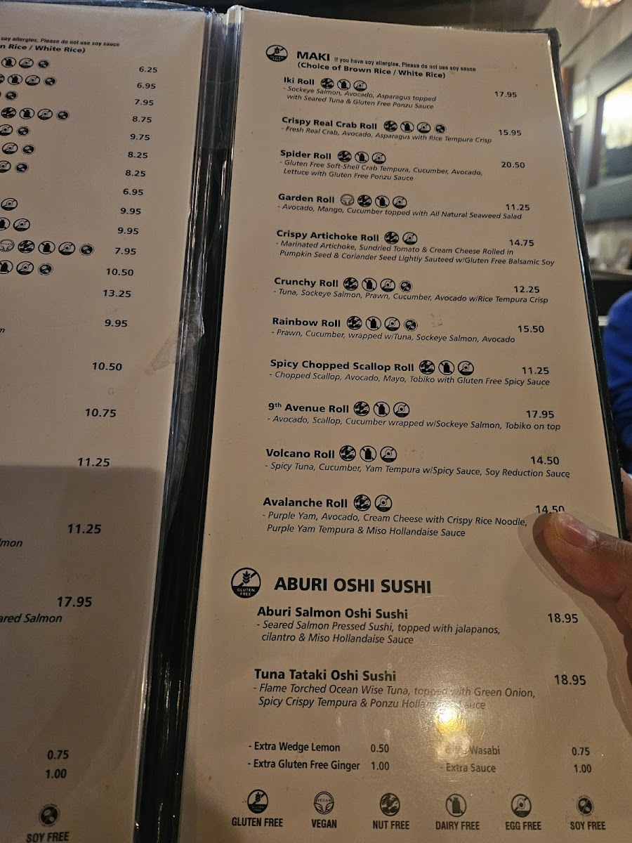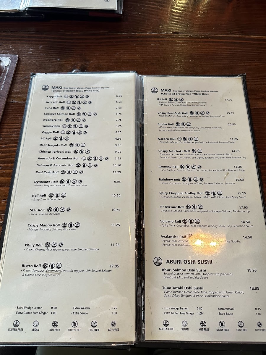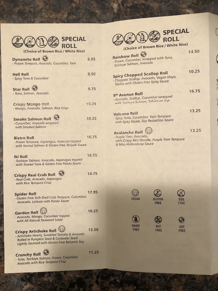 Gluten-free. Rolls: tuna, avocado, yammy, hell, bc, salmon avo, iki, dynamite, crispy mango.