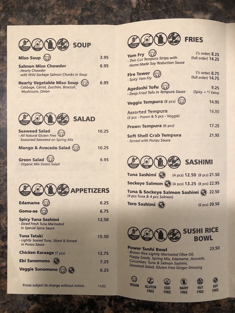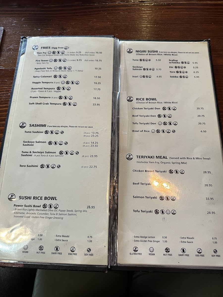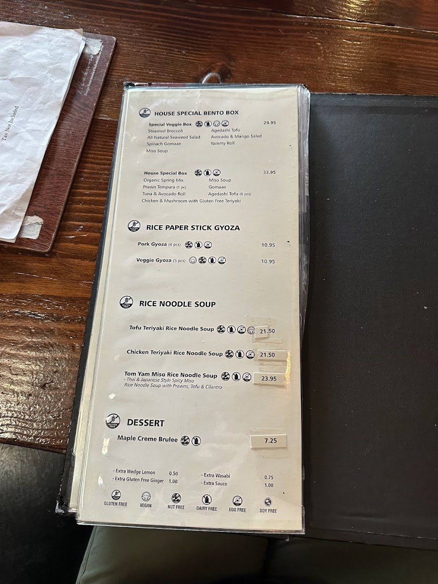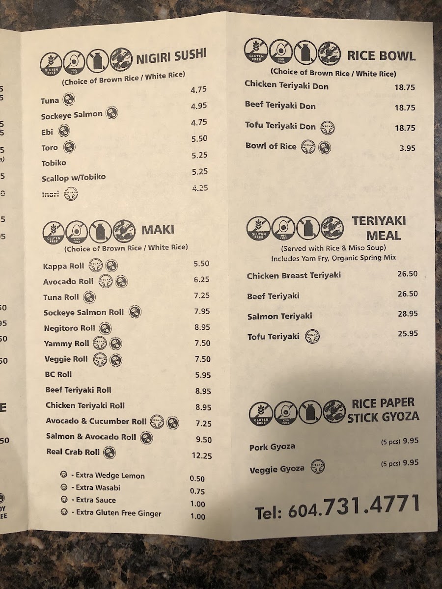 Gluten-free. Rolls: tuna, avocado, yammy, hell, bc, salmon avo, iki, dynamite, crispy mango.