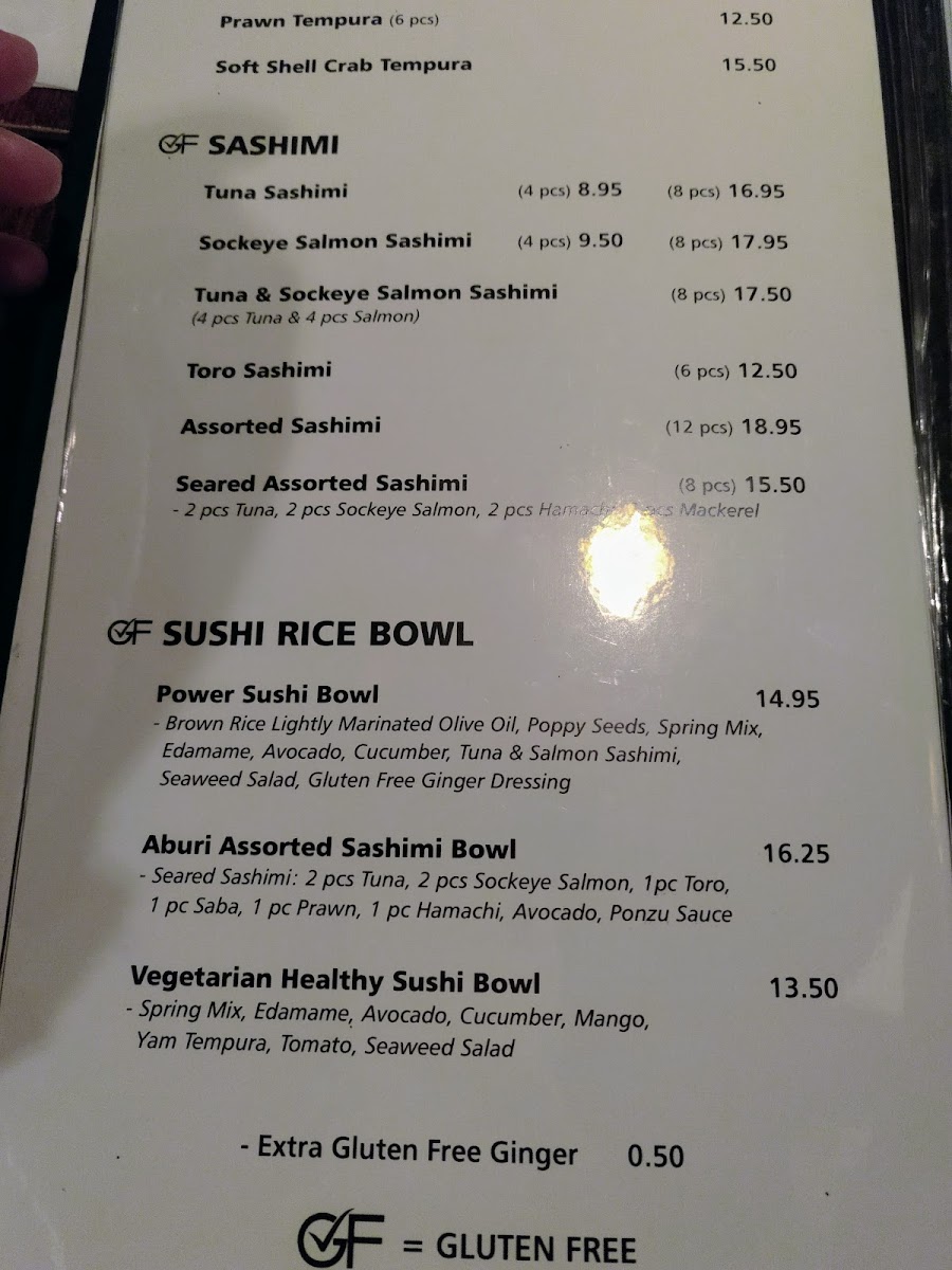 Gluten-free. Aburi: - tuna (one piece),toro (one piece), prawn (one piece), sockeye salmon (one piece), yellow tail (one piece), ika (one piece), saba (one piece).